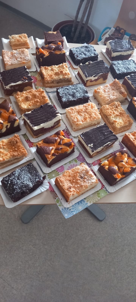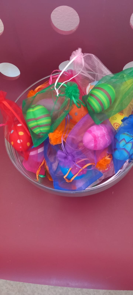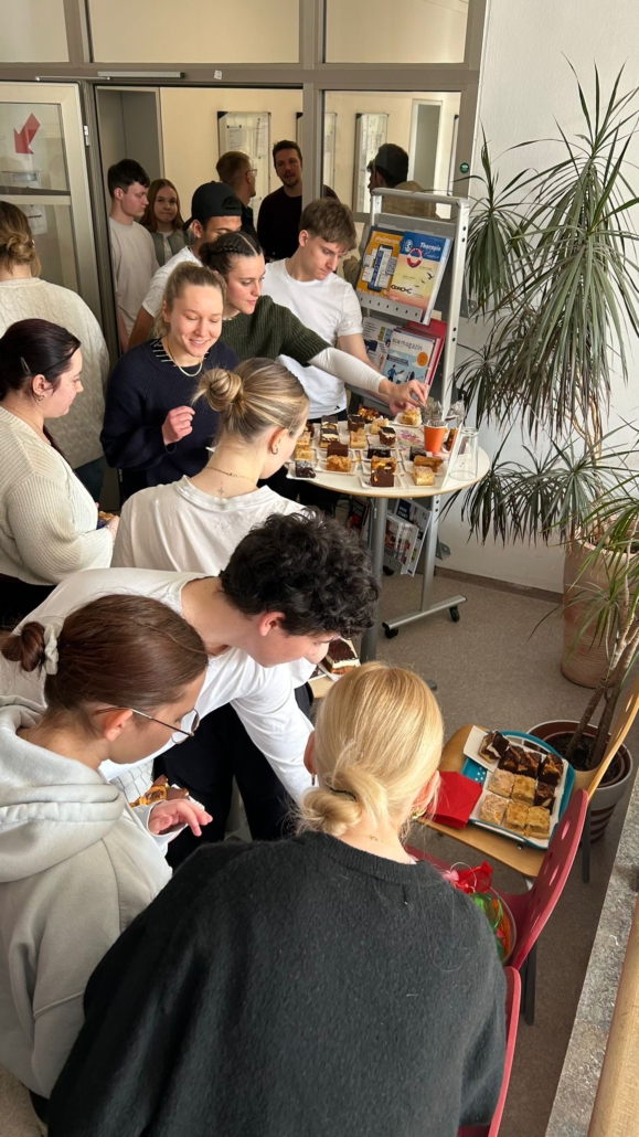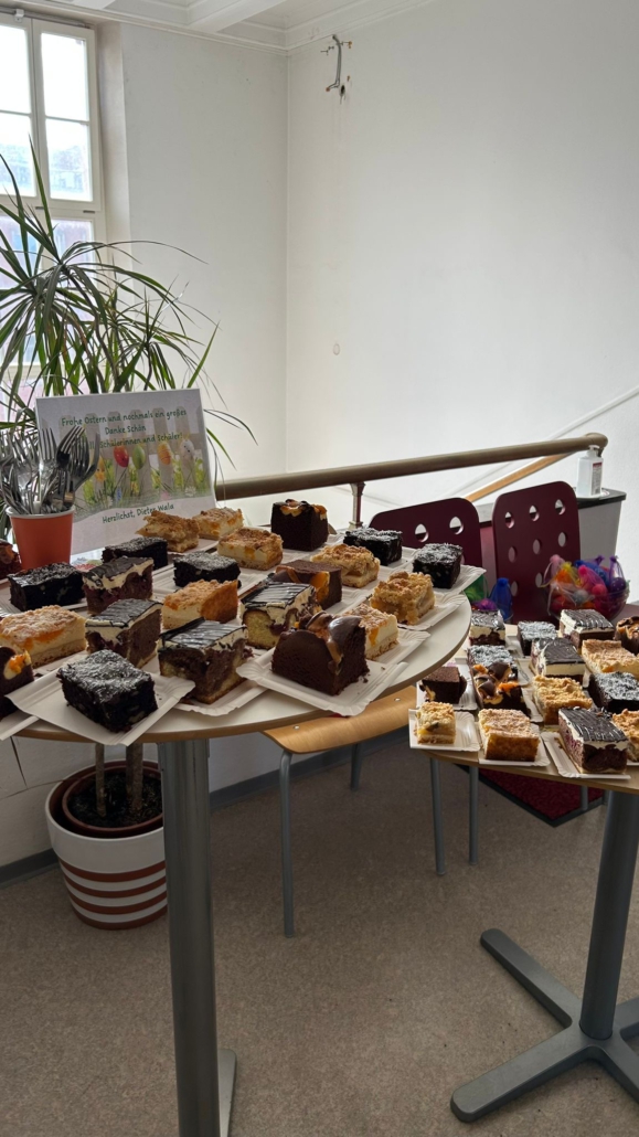 Erst suchen, dann naschen: Am letzten Schultag vor den Osterferien gab es vor dem Sekretariat eine süße Überraschung für alle Schülerinnen, Schüler und Lehrkräfte der BFS Erlangen. Ein Kuchenbuffet – und bunte Ostereier-Stressbälle für alle.